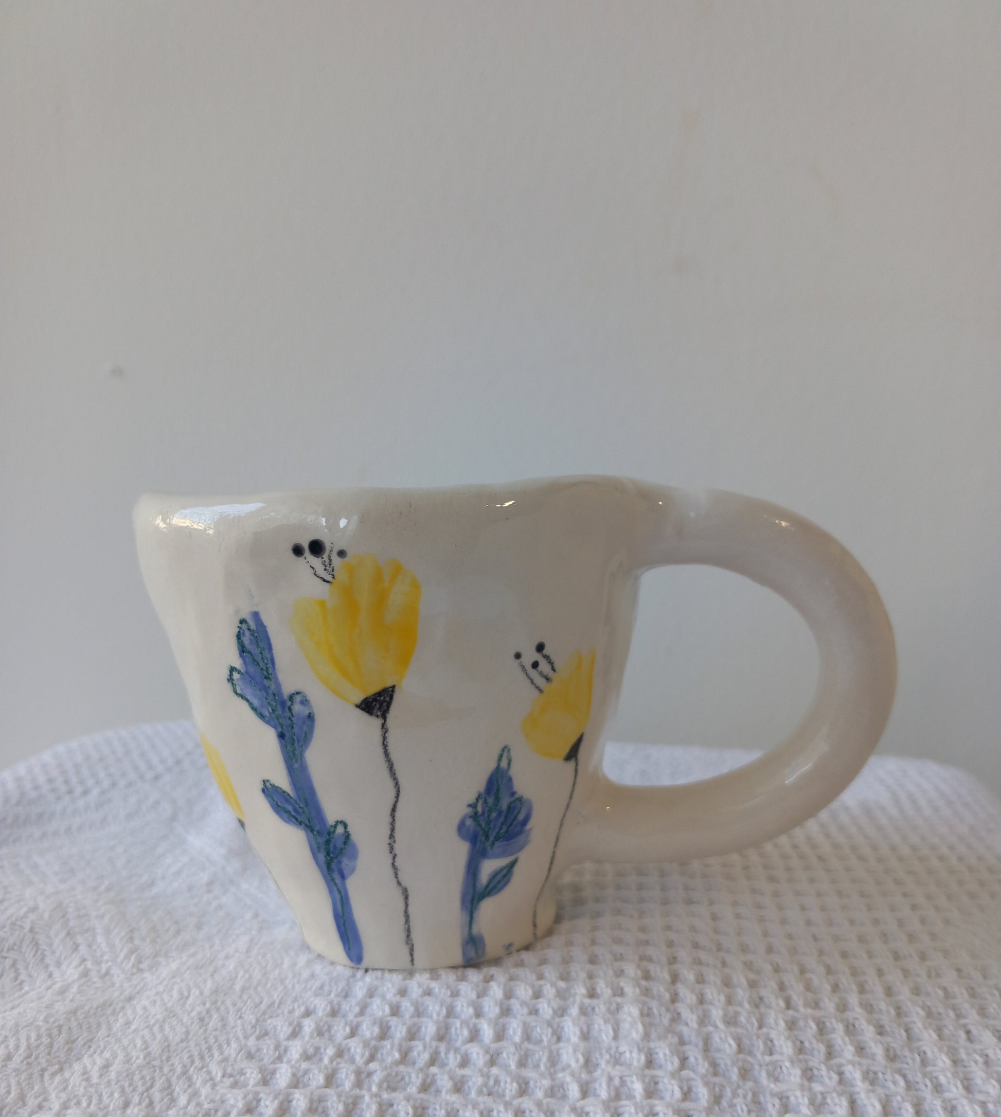 I fiori sono blu e gialli, è decorata con smalti sottocristallina e matita per ceramica.