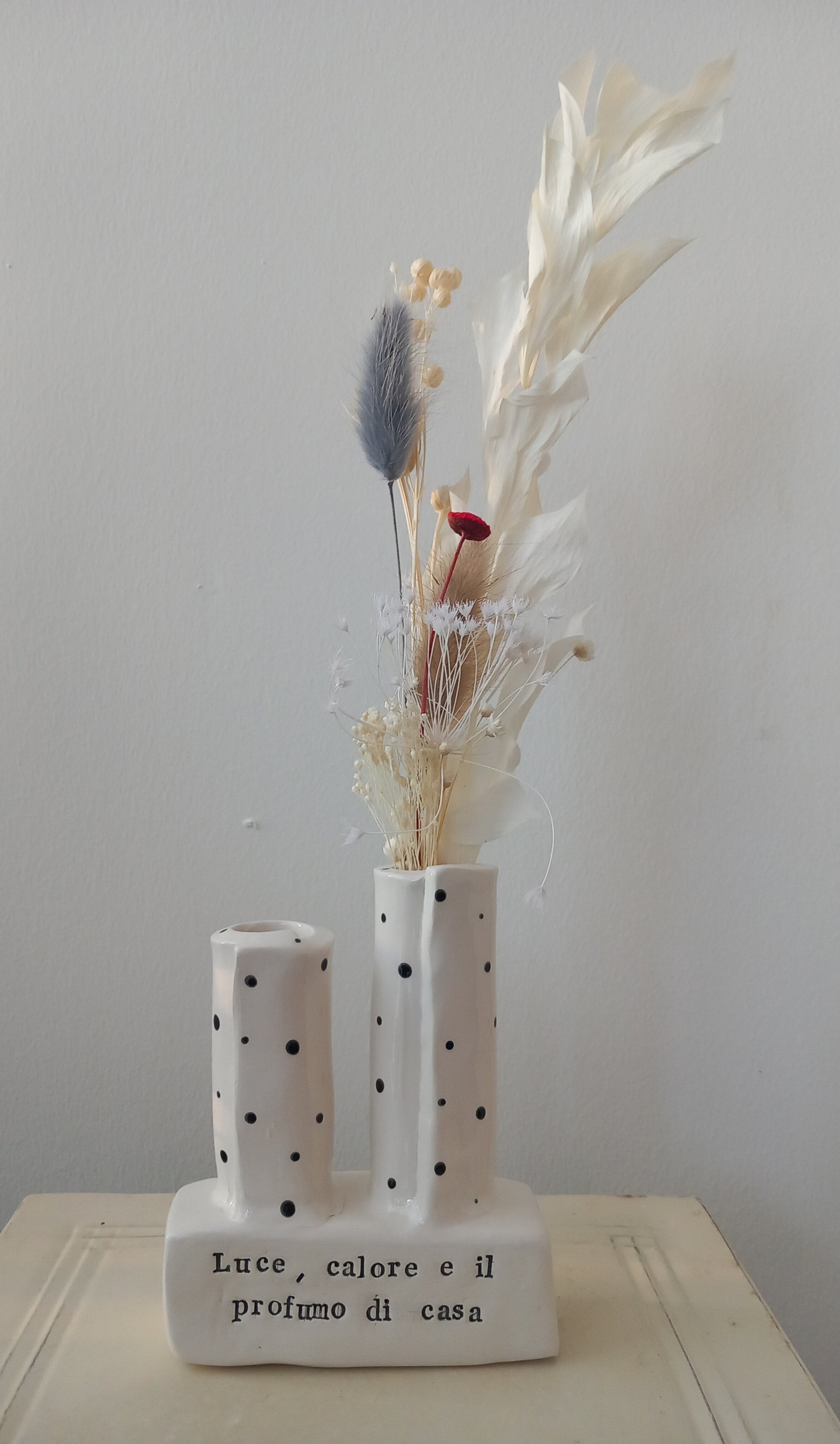 Vasetto doppio decorato con pois e scritta di colore nero.