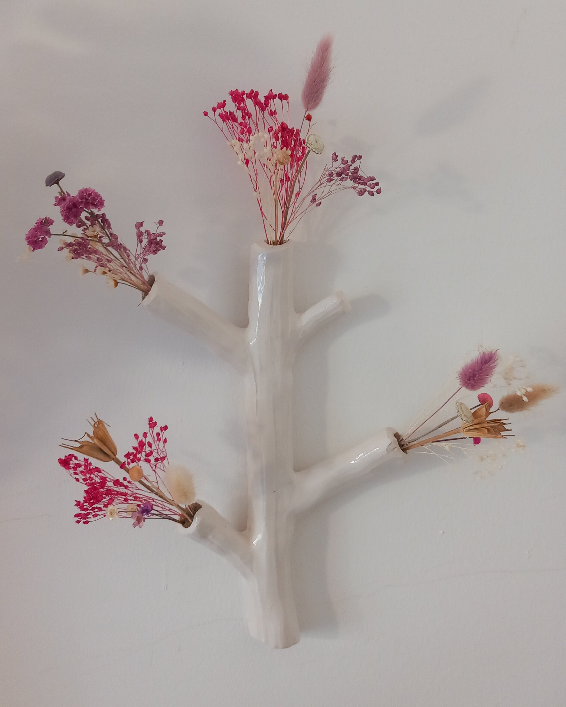 Particolare vaso a forma di ramo da appendere a parete. Nelle cavità viene inserita la spugna per poter tenere fermi i fiori secchi.
